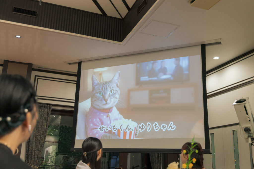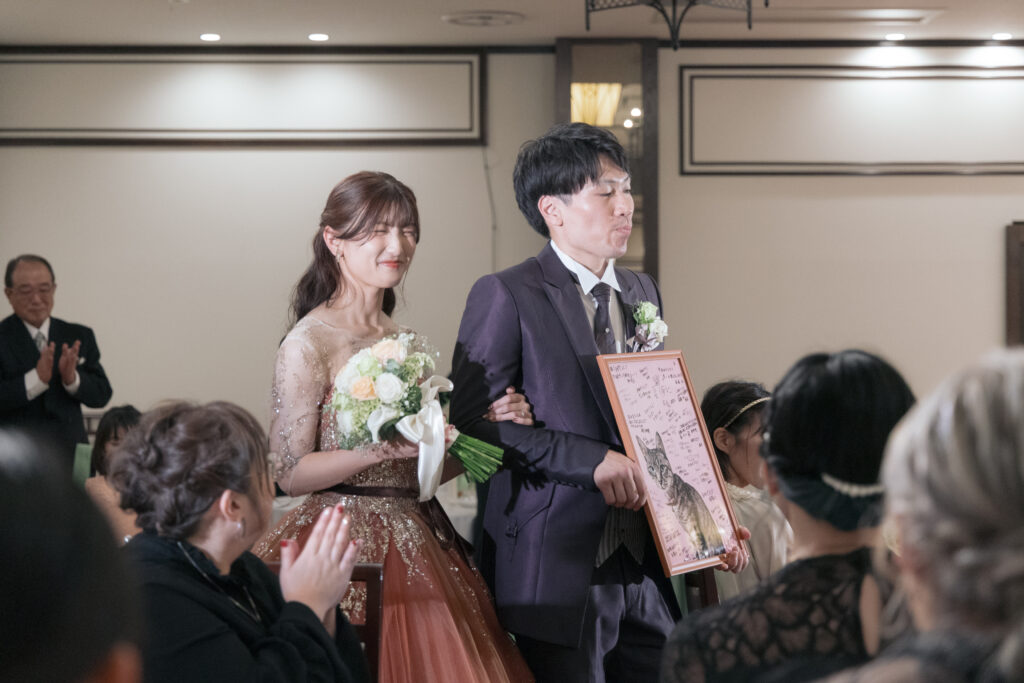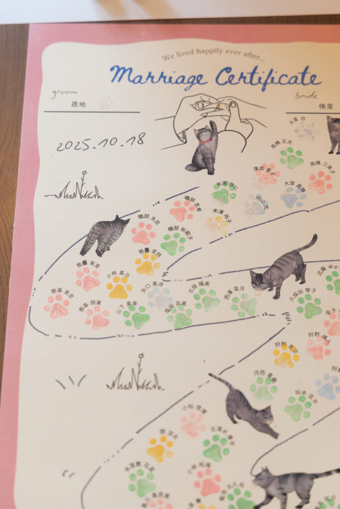 お二人の飼い猫「あずきちゃん」が歩みを進めるようなデザインの肉球スタンプの結婚証明書は、会場を和ませる可愛らしい仕上がりに。