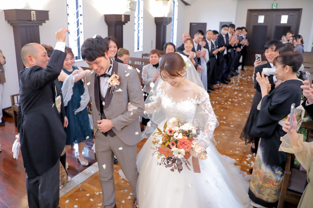 挙式後はゲストからのフラワーシャワーで2人を祝福!