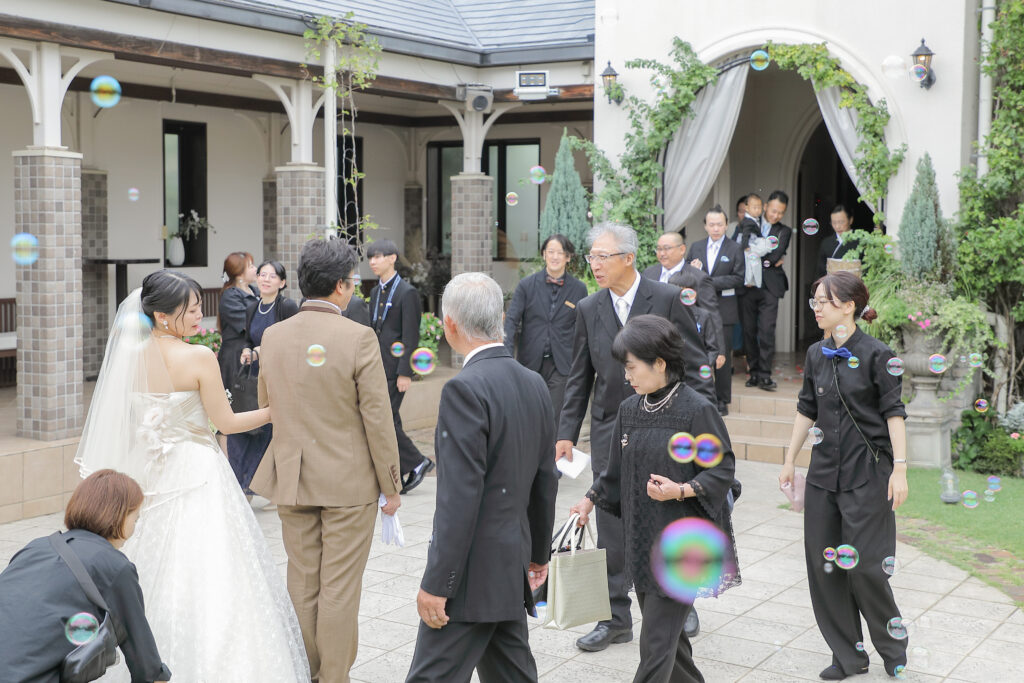 退場時にはフラワーシャワーとシャボン玉が舞い、