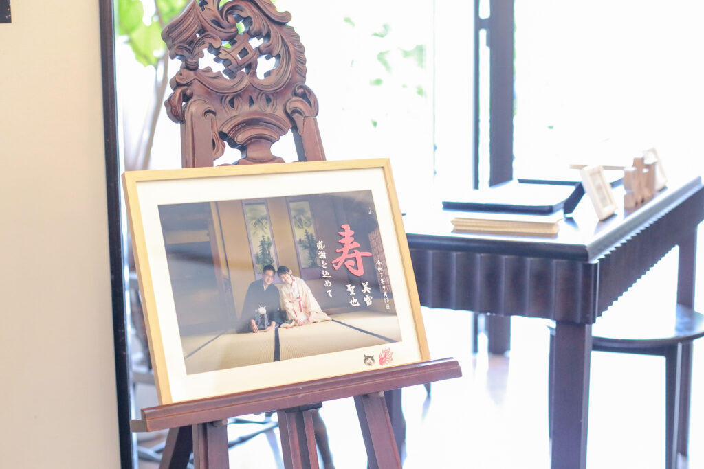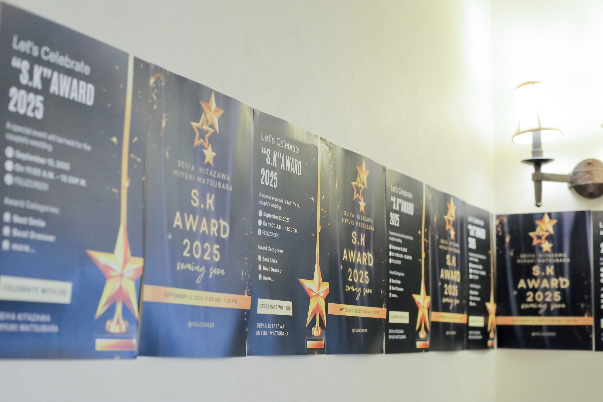 ウェルカムスペースには、前撮り写真のウェルカムボードやアワードポスター。