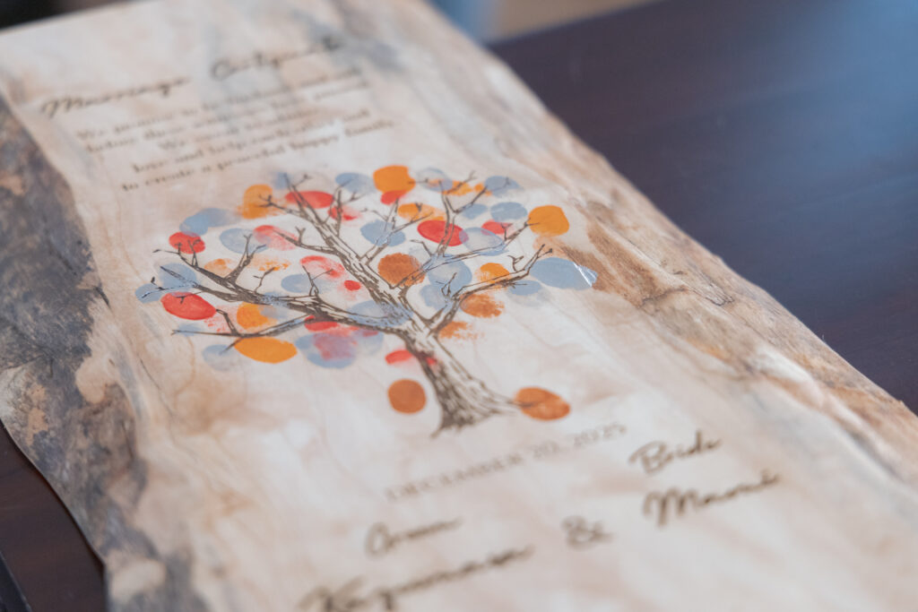 結婚証明書は、木のボードに指スタンプ。