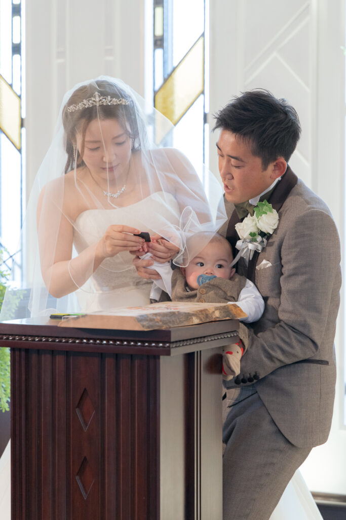 おふたりとお子さまも一緒に押して完成させる姿に、